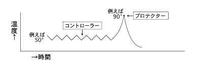 コントローラーは一定温度を保持するためのもので、一定温度を保持する機能がこわれたときに、最後の防衛手段として電源ラインをカットするためのものがプロテクターです。