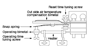 un contact M (établir le contact) et un contact B (couper le contact). La minuterie fonctionnant sur le principe du bimétal, elle subit naturellement l'influence des variations de température en été et en hiver. Il existe un bimétal pour compensation de la température extérieure qui permet de réduire cette influence au maximum. |